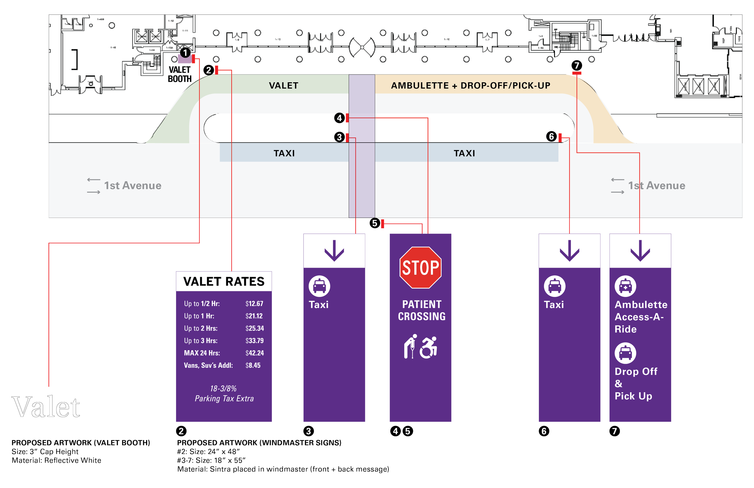 Wayfinding strategy developed for NYU Langone’s main hospital entrance, organizing curbside zones for valet, taxi, and Ambulette services through coordinated Windmaster signage placement.